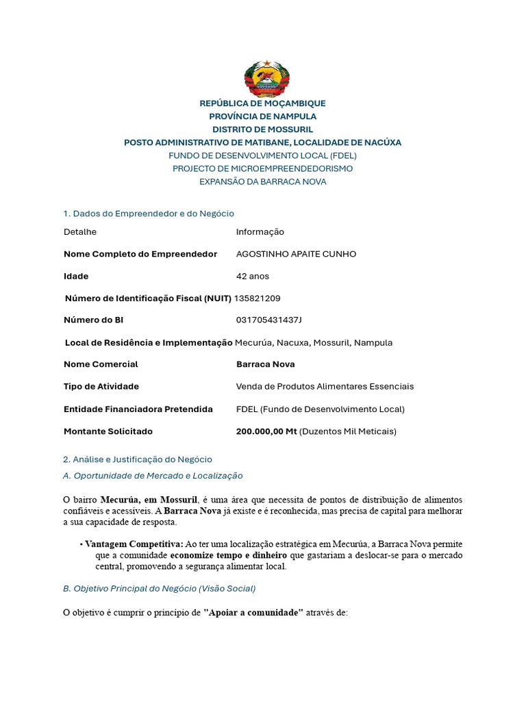 O plano demonstra que a Barraca Nova, após o investimento de 200.000,00Mt, tem a capacidade de