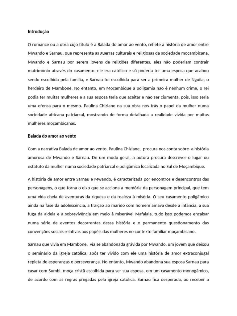 Com a narrativa Balada de amor ao vento, Paulina Chiziane, procura nos conta sobre a história