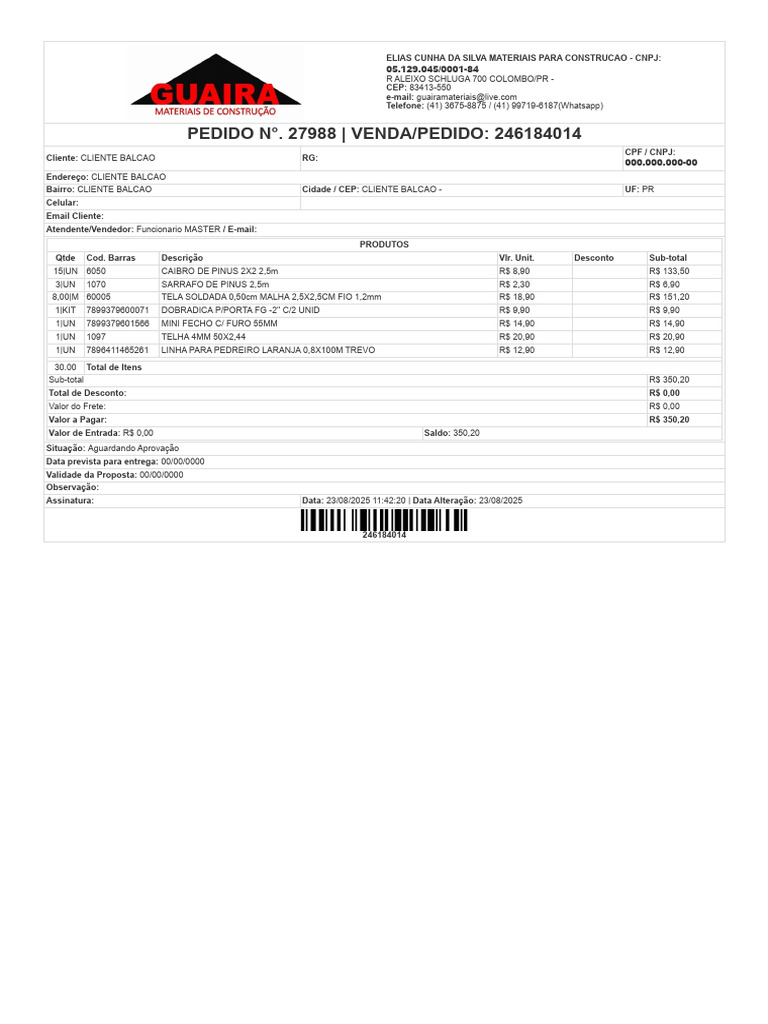 Bairro: CLIENTE BALCAO Cidade / CEP: CLIENTE BALCAO - UF: PR