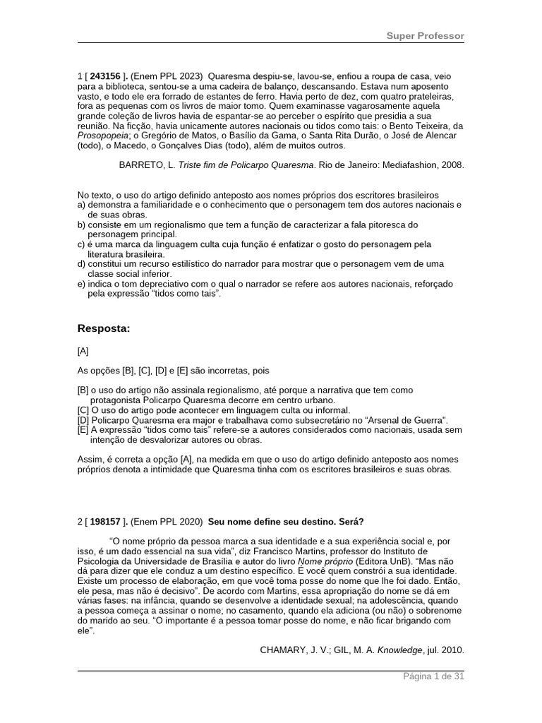1 [ 243156 ]. (Enem PPL 2023) Quaresma despiu-se, lavou-se, enfiou a roupa de casa, veio