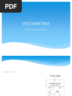 Introduo Mtodo eletroanaltico: Baseados em medidas de propriedades eltricas (corrente, tenso e resistncia) das espcies qumicas. So eles: Potenciometria, Coulometria, Voltametria, Condutometria, Eletrogravimetria Conceito de Voltametria: O potencial aplicado entre os dois eletrodos em forma de varredura, isto , variando-o a uma velocidade constante em funo do tempo. O potencial e a corrente resultante so registrados simultaneamente. A curva corrente vs. potencial obtida chamada de voltamograma. Voltametria cclica Mtodo usado para avaliar mecanismos de reaes redox em soluo; A resposta de corrente de um pequeno eletrodo estacionrio em uma soluo mantida em repouso excitada na forma de uma onda triangular; A onda triangular produz uma varredura no sentido direto e inverso; Ciclo repetido diversas vezes.