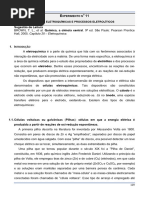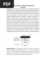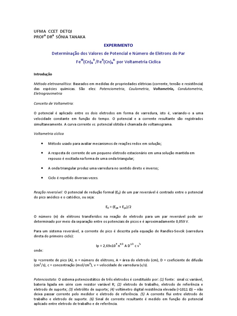 Tipos e funes de cada eletrodo A) Microeletrodo (de trabalho): onde ocorre a reao de interesse. O microeletrodo comumente feito de um material inerte, como ouro, platina, carbono, mercrio. Quando o microeletrodo constitudo de um eletrodo gotejante de mercrio, a tcnica chamada de polarografia. b) Eletrodo de referncia (geralmente de calomelano saturado ou de Ag / AgCl. Possui potencial conhecido, para ser comparado ao novo potencial da reao. c) Eletrodo auxiliar: fio enrolado de Pt: conduz eletricidade da fonte para o microeletrodo. Eletrlito de suporte: soluo de um sal conhecido que serve para medir a condutividade da soluo: cidos: HCl, H2SO4, H3PO4, etc., Bases: NaOH, KOH, NH4OH, etc. e Tampes: citrato, fosfato, borato, etc. Desaerar a soluo: H a necessidade da remoo do oxignio atmosfrico dissolvido nas solues. Isto porque o O2 eletroativo e produz duas ondas polarogrficas nessa regio (catdica). Por isso tem que desaerar a soluo pela passagem de um gs inerte, isento de O 2. As tcnicas voltamtricas so aplicadas na determinao de elementos eletroativos a nvel de traos, apresentando resultados com boas preciso e exatido. Este experimento objetiva utilizar a tcnica de voltametria cclica (VC) para determinar os III 3II 4valores de potencial (Ep) e nmero de eltrons (n) do par Fe (CN)6 /Fe (CN)6 . Procedimento Preparar uma soluo estoque de K3Fe(CN)6 1,0 mM em Na2SO4, 0,5 mol/L. Efetuar um pr-tratamento da superfcie do eletrodo de trabalho atravs de um polimento com alumina, lavagem com gua e ultra-som. Preencher a clula eletroqumica com K3Fe(CN)6 at imerso dos eletrodos. Desaerar a soluo com gs inerte (N2 ou argnio) por 10 min. Durante a desoxigenao, ajustar os parmetros do equipamento (com eletrodo de trabalho desconectado): Ei = -200 mV; Ef = +800 mV; direo = negativa para a positiva; v = 100 mV/s. Conectar o eletrodo de trabalho. III 3II 4 Iniciar a varredura para obter o voltamograma cclico (VC) do par redox Fe (CN)6 /Fe (CN)6 . Os efeitos de v so observados, repetindo um experimento VC para cada velocidade (25, 50, 75, 100 mV/s). Tratamento de dados: Do voltamograma cclico obtido para o par Fe (CN)6 / Fe (CN)6 , em eletrodo +2 +3 de platina, determinar os valores de Ep (potencial de pico do par Fe /Fe ). Bibliografia Consultada Kissinger, P. T. e Heineman, W. R. Laboratory Techniques in Electroanalytical Chemistry , Dekker, New York. 2007. Skoog, D. A.; Holler, F. J. e Nieman, T. A. Princpio de Anlise Instrumental, Artmed Editora S.A, So Paulo, 2009.