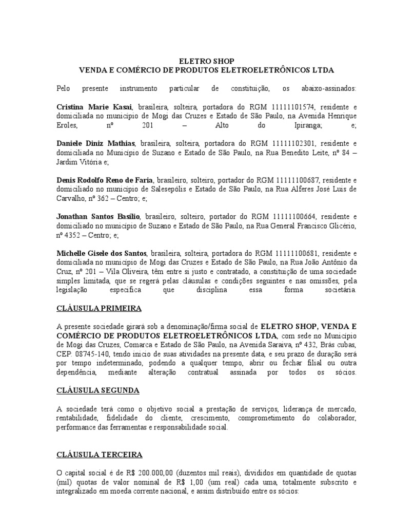 Cristina Marie Kasai, brasileira, solteira, portadora do RGM 11111101574, residente e domiciliada no municpio de Mogi das Cruzes e Estado de So Paulo, na Avenida Henrique Eroles, n 201 Alto do Ipiranga; e; Daniele Diniz Mathias, brasileira, solteira, portadora do RGM 11111102301, residente e domiciliada no Municpio de Suzano e Estado de So Paulo, na Rua Benedito Leite, n 84 Jardim Vitria e; Denis Rodolfo Reno de Faria, brasileiro, solteiro, portador do RGM 11111100687, residente e domiciliado no municpio de Saleseplis e Estado de So Paulo, na Rua Alferes Jos Luis de Carvalho, n 362 Centro; e; Jonathan Santos Baslio, brasileiro, solteiro, portador do RGM 11111100664, residente e domiciliado no municpio de Suzano e Estado de So Paulo, na Rua General Francisco Glicrio, n 4352 Centro; e; Michelle Gisele dos Santos, brasileira, solteira, portadora do RGM 11111100681, residente e domiciliada no municpio de Mogi das Cruzes e Estado de So Paulo, na Rua Joo Antnio da Cruz, n 201 Vila Oliveira, tm entre si justo e contratado, a constituio de uma sociedade simples limitada, que se reger pelas clusulas e condies seguintes e nas omisses, pela legislao especifica que disciplina essa forma societria. CLUSULA PRIMEIRA A presente sociedade girar sob a denominao/firma social de ELETRO SHOP, VENDA E COMRCIO DE PRODUTOS ELETROELETRNICOS LTDA, com sede no Municpio de Mogi das Cruzes, Comarca e Estado de So Paulo, na Avenida Saraiva, n 432, Brs cubas, CEP: 08745-140, tendo inicio de suas atividades na presente data, e seu prazo de durao ser por tempo indeterminado, podendo a qualquer tempo, abrir ou fechar filial ou outra dependncia, mediante alterao contratual assinada por todos os scios. CLUSULA SEGUNDA A sociedade ter como o objetivo social a prestao de servios, liderana de mercado, rentabilidade, fidelidade do cliente, crescimento, comprometimento do colaborador, performance das ferramentas e responsabilidade social. CLUSULA TERCEIRA O capital social de R$ 200.000,00 (duzentos mil reais), divididos em quantidade de quotas (mil) quotas de valor nominal de R$ 1,00 (um real) cada uma, totalmente subscrito e integralizado em moeda corrente nacional, e assim distribudo entre os scios: