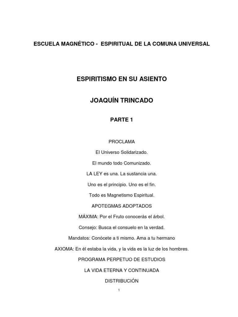 PROCLAMA El Universo Solidarizado. El mundo todo Comunizado. LA LEY es una. La sustancia una. Uno es el principio. Uno es el fin. Todo es Magnetismo Espiritual. APOTEGMAS ADOPTADOS MXIMA: Por el Fruto conocers el rbol. Consejo: Busca el consuelo en la verdad. Mandatos: Concete a ti mismo. Ama a tu hermano AXIOMA: En l estaba la vida, y la vida es la luz de los hombres. PROGRAMA PERPETUO DE ESTUDIOS LA VIDA ETERNA Y CONTINUADA DISTRIBUCIN