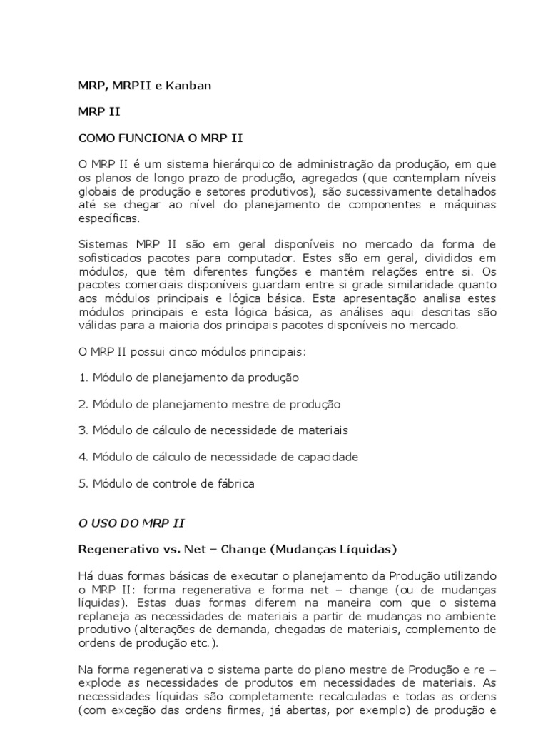 o prazo de produo, agregados (que contemplam nveis globais de produo e setores produtivos), so sucessivamente detalhados at se chegar ao nvel do planejamento de componentes e mquinas especficas. Sistemas MRP II so em geral disponveis no mercado da forma de sofisticados pacotes para computador. Estes so em geral, divididos em mdulos, que tm diferentes funes e mantm relaes entre si. Os pacotes comerciais disponveis guardam entre si grade similaridade quanto aos mdulos principais e lgica bsica. Esta apresentao analisa estes mdulos principais e esta lgica bsica, as anlises aqui descritas so vlidas para a maioria dos principais pacotes disponveis no mercado. O MRP II possui cinco mdulos principais: 1. Mdulo de planejamento da produo 2. Mdulo de planejamento mestre de produo 3. Mdulo de clculo de necessidade de materiais 4. Mdulo de clculo de necessidade de capacidade 5. Mdulo de controle de fbrica O USO DO MRP II Regenerativo vs. Net Change (Mudanas Lquidas) H duas formas bsicas de executar o planejamento da Produo utilizando o MRP II: forma regenerativa e forma net change (ou de mudanas lquidas). Estas duas formas diferem na maneira com que o sistema replaneja as necessidades de materiais a partir de mudanas no ambiente produtivo (alteraes de demanda, chegadas de materiais, complemento de ordens de produo etc.). Na forma regenerativa o sistema parte do plano mestre de Produo e re explode as necessidades de produtos em necessidades de materiais. As necessidades lquidas so completamente recalculadas e todas as ordens (com exceo das ordens firmes, j abertas, por exemplo) de produo e