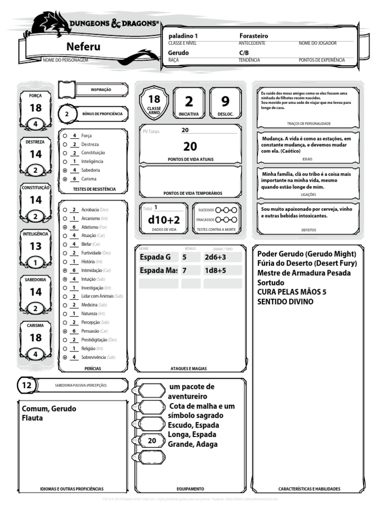 NOME DO PERSONAGEM RAÇA TENDÊNCIA PONTOS DE EXPERIÊNCIA