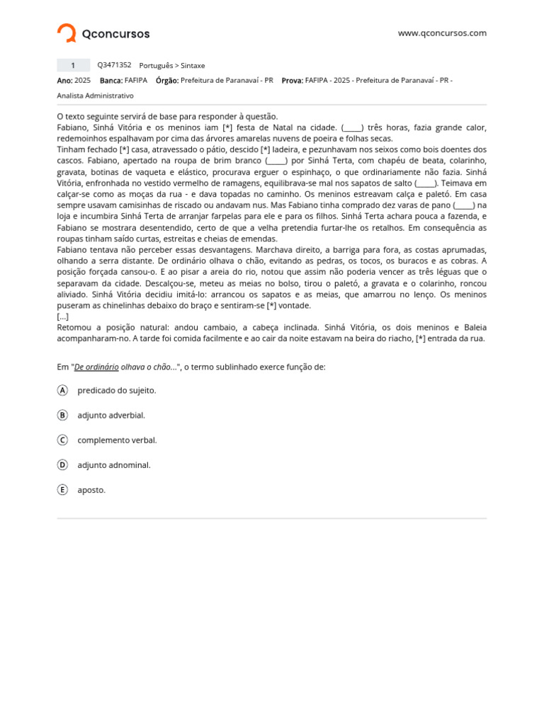 Em "De ordinário olhava o chão...", o termo sublinhado exerce função de: