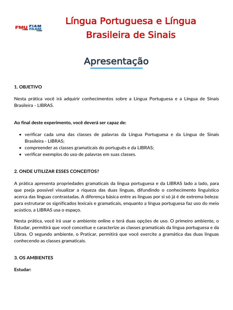Libras. O segundo ambiente, o Praticar, permitirá que você exercite a gramática das duas línguas