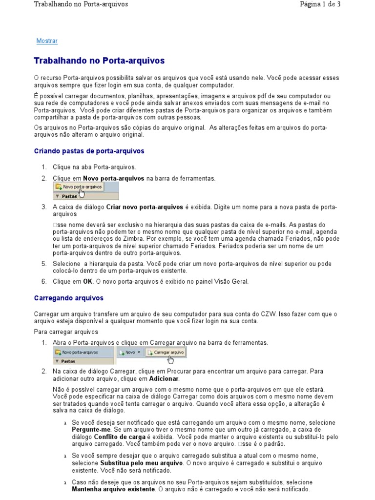 O recurso Porta-arquivos possibilita salvar os arquivos que voc est usando nele. Voc pode acessar esses arquivos sempre que fizer login em sua conta, de qualquer computador. possvel carregar documentos, planilhas, apresentaes, imagens e arquivos pdf de seu computador ou sua rede de computadores e voc pode ainda salvar anexos enviados com suas mensagens de e-mail no Porta-arquivos. Voc pode criar diferentes pastas de Porta-arquivos para organizar os arquivos e tambm compartilhar a pasta de porta-arquivos com outras pessoas. Os arquivos no Porta-arquivos so cpias do arquivo original. As alteraes feitas em arquivos do portaarquivos no alteram o arquivo original.