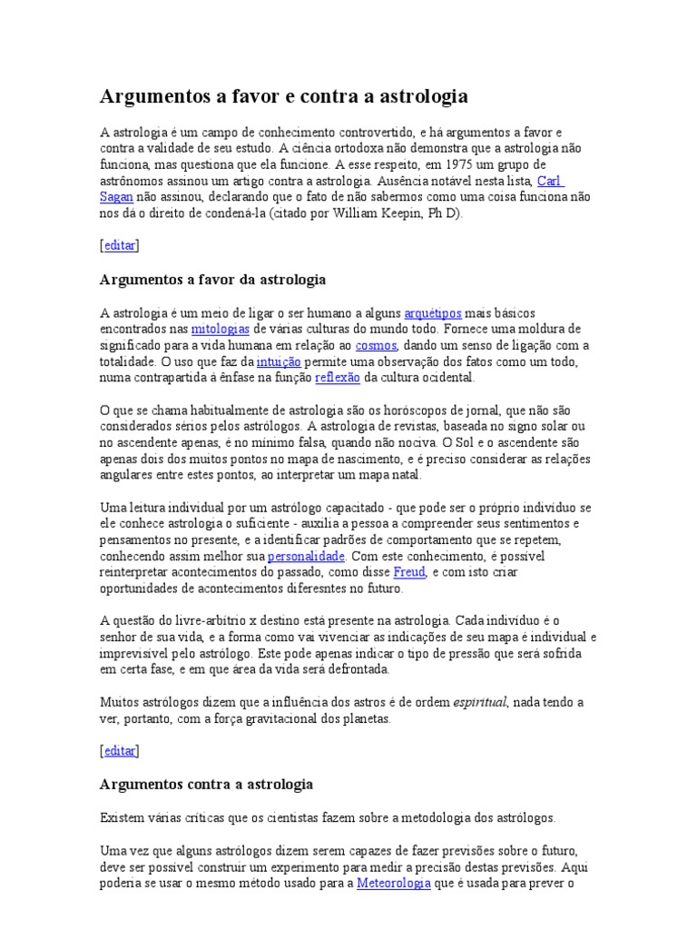 A astrologia um campo de conhecimento controvertido, e h argumentos a favor e contra a validade de seu estudo. A cincia ortodoxa no demonstra que a astrologia no funciona, mas questiona que ela funcione. A esse respeito, em 1975 um grupo de astrnomos assinou um artigo contra a astrologia. Ausncia notvel nesta lista, Carl Sagan no assinou, declarando que o fato de no sabermos como uma coisa funciona no nos d o direito de conden-la (citado por William Keepin, Ph D). [editar]