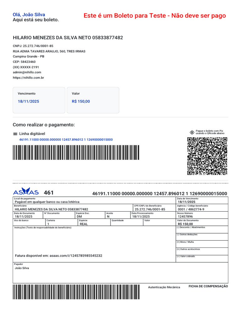 Olá, João Silva Este é um Boleto para Teste - Não deve ser pago