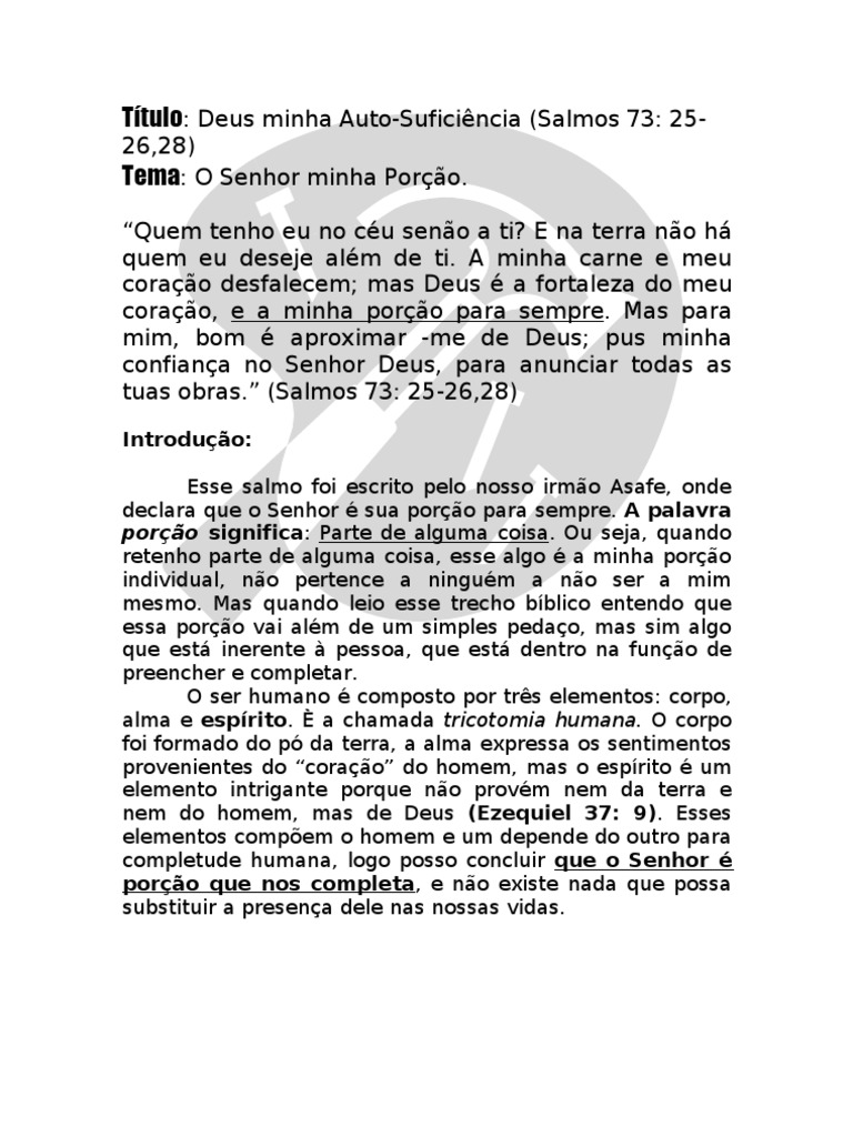 Introduo: Esse salmo foi escrito pelo nosso irmo Asafe, onde declara que o Senhor sua poro para sempre. A palavra poro significa: Parte de alguma coisa. Ou seja, quando retenho parte de alguma coisa, esse algo a minha poro individual, no pertence a ningum a no ser a mim mesmo. Mas quando leio esse trecho bblico entendo que essa poro vai alm de um simples pedao, mas sim algo que est inerente pessoa, que est dentro na funo de preencher e completar. O ser humano composto por trs elementos: corpo, alma e esprito. a chamada tricotomia humana. O corpo foi formado do p da terra, a alma expressa os sentimentos provenientes do corao do homem, mas o esprito um elemento intrigante porque no provm nem da terra e nem do homem, mas de Deus (Ezequiel 37: 9). Esses elementos compem o homem e um depende do outro para completude humana, logo posso concluir que o Senhor poro que nos completa, e no existe nada que possa substituir a presena dele nas nossas vidas.