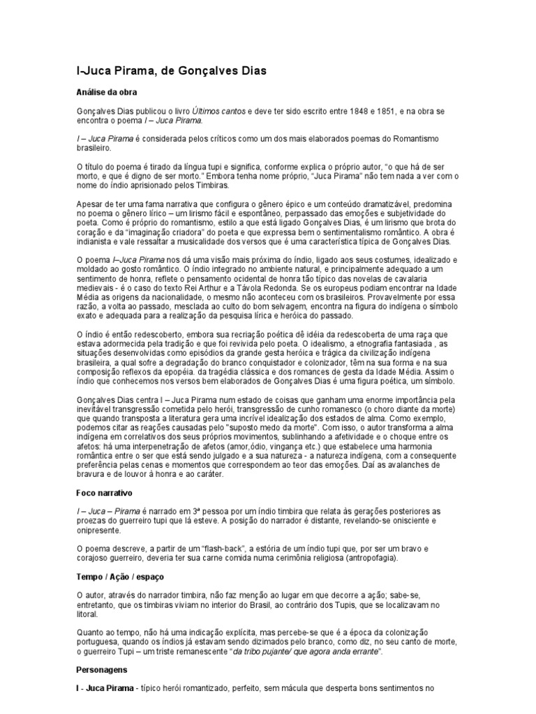 Anlise da obra Gonalves Dias publicou o livro ltimos cantos e deve ter sido escrito entre 1848 e 1851, e na obra se encontra o poema I Juca Pirama. I Juca Pirama considerada pelos crticos como um dos mais elaborados poemas do Romantismo brasileiro. O ttulo do poema tirado da lngua tupi e significa, conforme explica o prprio autor, o que h de ser morto, e que digno de ser morto. Embora tenha nome prprio, Juca Pirama no tem nada a ver com o nome do ndio aprisionado pelos Timbiras. Apesar de ter uma fama narrativa que configura o gnero pico e um contedo dramatizvel, predomina no poema o gnero lrico um lirismo fcil e espontneo, perpassado das emoes e subjetividade do poeta. Como prprio do romantismo, estilo a que est ligado Gonalves Dias, um lirismo que brota do corao e da imaginao criadora do poeta e que expressa bem o sentimentalismo romntico. A obra indianista e vale ressaltar a musicalidade dos versos que uma caracterstica tpica de Gonalves Dias. O poema IJuca Pirama nos d uma viso mais prxima do ndio, ligado aos seus costumes, idealizado e moldado ao gosto romntico. O ndio integrado no ambiente natural, e principalmente adequado a um sentimento de honra, reflete o pensamento ocidental de honra to tpico das novelas de cavalaria medievais - o caso do texto Rei Arthur e a Tvola Redonda. Se os europeus podiam encontrar na Idade Mdia as origens da nacionalidade, o mesmo no aconteceu com os brasileiros. Provavelmente por essa razo, a volta ao passado, mesclada ao culto do bom selvagem, encontra na figura do indgena o smbolo exato e adequada para a realizao da pesquisa lrica e herica do passado. O ndio ento redescoberto, embora sua recriao potica d idia da redescoberta de uma raa que estava adormecida pela tradio e que foi revivida pelo poeta. O idealismo, a etnografia fantasiada , as situaes desenvolvidas como episdios da grande gesta herica e trgica da civilizao indgena brasileira, a qual sofre a degradao do branco conquistador e colonizador, tm na sua forma e na sua composio reflexos da epopia. da tragdia clssica e dos romances de gesta da Idade Mdia. Assim o ndio que conhecemos nos versos bem elaborados de Gonalves Dias uma figura potica, um smbolo. Gonalves Dias centra I Juca Pirama num estado de coisas que ganham uma enorme importncia pela inevitvel transgresso cometida pelo heri, transgresso de cunho romanesco (o choro diante da morte) que quando transposta a literatura gera uma incrvel idealizao dos estados de alma. Como exemplo, podemos citar as reaes causadas pelo "suposto medo da morte". Com isso, o autor transforma a alma indgena em correlativos dos seus prprios movimentos, sublinhando a afetividade e o choque entre os afetos: h uma interpenetrao de afetos (amor,dio, vingana etc.) que estabelece uma harmonia romntica entre o ser que est sendo julgado e a sua natureza - a natureza indgena, com a consequente preferncia pelas cenas e momentos que correspondem ao teor das emoes. Da as avalanches de bravura e de louvor honra e ao carter. Foco narrativo I Juca Pirama narrado em 3 pessoa por um ndio timbira que relata s geraes posteriores as proezas do guerreiro tupi que l esteve. A posio do narrador distante, revelando-se onisciente e onipresente. O poema descreve, a partir de um flash-back, a estria de um ndio tupi que, por ser um bravo e corajoso guerreiro, deveria ter sua carne comida numa cerimnia religiosa (antropofagia). Tempo / Ao / espao O autor, atravs do narrador timbira, no faz meno ao lugar em que decorre a ao; sabe-se, entretanto, que os timbiras viviam no interior do Brasil, ao contrrio dos Tupis, que se localizavam no litoral. Quanto ao tempo, no h uma indicao explcita, mas percebe-se que a poca da colonizao portuguesa, quando os ndios j estavam sendo dizimados pelo branco, como diz, no seu canto de morte, o guerreiro Tupi um triste remanescente da tribo pujante/ que agora anda errante. Personagens I - Juca Pirama - tpico heri romantizado, perfeito, sem mcula que desperta bons sentimentos no