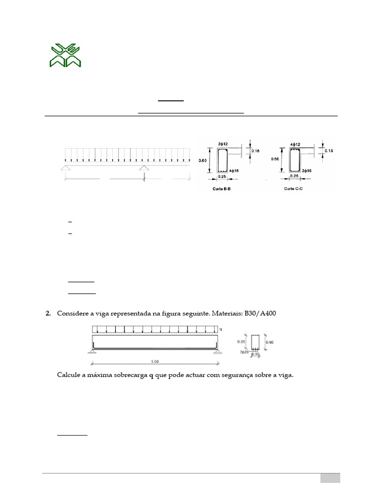 2. Considere a viga representada na figura seguinte. Materiais: B30/A400