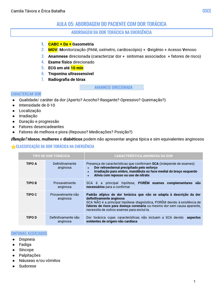 AULA 05: ABORDAGEM DO PACIENTE COM DOR TORÁCICA