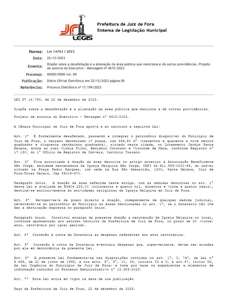 Parágrafo único. Constitui encargo da presente doação a manutenção da Igreja Melquita no local,