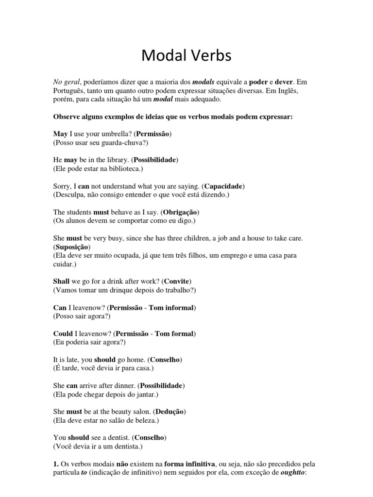 No geral, poderamos dizer que a maioria dos modals equivale a poder e dever. Em Portugus, tanto um quanto outro podem expressar situaes diversas. Em Ingls, porm, para cada situao h um modal mais adequado. Observe alguns exemplos de ideias que os verbos modais podem expressar: May I use your umbrella? (Permisso) (Posso usar seu guarda-chuva?) He may be in the library. (Possibilidade) (Ele pode estar na biblioteca.) Sorry, I can not understand what you are saying. (Capacidade) (Desculpa, no consigo entender o que voc est dizendo.) The students must behave as I say. (Obrigao) (Os alunos devem se comportar como eu digo.) She must be very busy, since she has three children, a job and a house to take care. (Suposio) (Ela deve ser muito ocupada, j que tem trs filhos, um emprego e uma casa para cuidar.) Shall we go for a drink after work? (Convite) (Vamos tomar um drinque depois do trabalho?) Can I leavenow? (Permisso - Tom informal) (Posso sair agora?) Could I leavenow? (Permisso - Tom formal) (Eu poderia sair agora?) It is late, you should go home. (Conselho) ( tarde, voc devia ir para casa.) She can arrive after dinner. (Possibilidade) (Ela pode chegar depois do jantar.) She must be at the beauty salon. (Deduo) (Ela deve estar no salo de beleza.) You should see a dentist. (Conselho) (Voc devia ir a um dentista.) 1. Os verbos modais no existem na forma infinitiva, ou seja, no so precedidos pela partcula to (indicao de infinitivo) nem seguidos por ela, com exceo de oughtto: