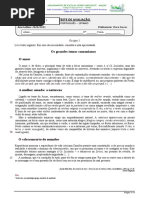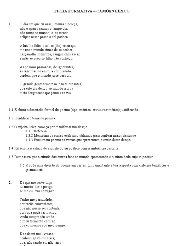 para quem dita9 no tem, valem pouco e custam muito. Rompe toda a pedra dura, faz os homens imortais o trabalho, quando atura10; mas querer achar ventura11 sem ventura, por demais. 5.1 Observa os versos: Todo o trabalhado bem / promete gostoso fruito (v.2-3) 5.1.1 Identifica a classe a que pertence a palavra sublinhada. 5.1.2 Servindo-te do processo morfolgico de converso, modifica a classe da palavra e integra-a numa frase que evidencie o seu novo sentido. 5.2 Rel o excerto do poema: Rompe toda a pedra dura, faz os homens imortais o trabalho, quando atura; 5.2.1 Divide e classifica as oraes presentes. 5.2.2 Analisa sintaticamente a segunda orao. 5.3 Transforma o par de frases seguinte numa nica frase complexa, estabelecendo, em casa uma das alneas, a relao indicada e procedendo s alteraes necessrias. O trabalho compensa. Todas as tarefas laborais exigem esforo. a. Concesso 6. Composio a) Cames constata e denuncia em diversos dos seus textos o desconcerto do mundo. Elabora um breve texto sobre o significado desta expresso na lrica camoniana. b) Elabora uma sntese sobre o tratamento da figura feminina e da Natureza na lrica de Cames. c) Comprova a natureza autobiogrfica da composio a partir do levantamento dos decticos pessoais de cada uma das classes de palavras indicada: a. pronomes pessoais; b. verbos c. determinantes possessivos Errei todo o discurso12 de meus anos; dei causa [a] que a Fortuna castigasse as minhas mal fundadas esperanas. De amot no vi seno breves enganos. Oh! Quem tanto pudesse que fartasse este meu duro gnio de vinganas! b. Oposio.