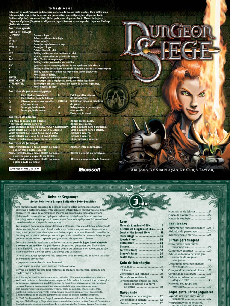 As informaes contidas neste documento, inclusive URLs e outras referncias a sites da Web, esto sujeitas a alteraes sem aviso prvio. Salvo indicao em contrrio, os exemplos de empresas, organizaes, produtos, nomes de domnios, endereos de e-mail, logotipos, pessoas, lugares e eventos aqui mencionados so ctcios e nenhuma associao com qualquer empresa, organizao, produto, nome de domnio, endereo de e-mail, logotipo, pessoa, lugar ou evento intencional e no deve assim deve ser pressuposta. responsabilidade do usurio cumprir todas as leis de direitos autorais aplicveis. 2002 Gas Powered Games Corp. Todos os direitos reservados. Gas Powered Games, o logotipo GPG e Dungeon Siege so marcas comerciais exclusivas da Gas Powered Games Corp. Os direitos autorais deste manual so de propriedade da Gas Powered Games Corp. e so protegidos por leis de direitos autorais dos EUA e internacionais. Este manual no pode ser copiado, reproduzido, traduzido ou reduzido para nenhum meio eletrnico ou formato legvel por mquina sem a autorizao prvia da Gas Powered Games Corp. Publicado pela Microsoft Corporation. Partes 2002 Microsoft Corporation. Todos os direitos reservados. Microsoft, MS-DOS, Windows, Windows NT e ZoneMatch so marcas registradas ou comerciais da Microsoft Corporation nos Estados Unidos e/ou em outros pases. Usa Bink Video. 1997-2002 RAD Game Tools, Inc. Os nomes de empresas e produtos reais aqui mencionados podem ser marcas registradas de seus respectivos proprietrios. 0202 Pea n X08-25516 XC