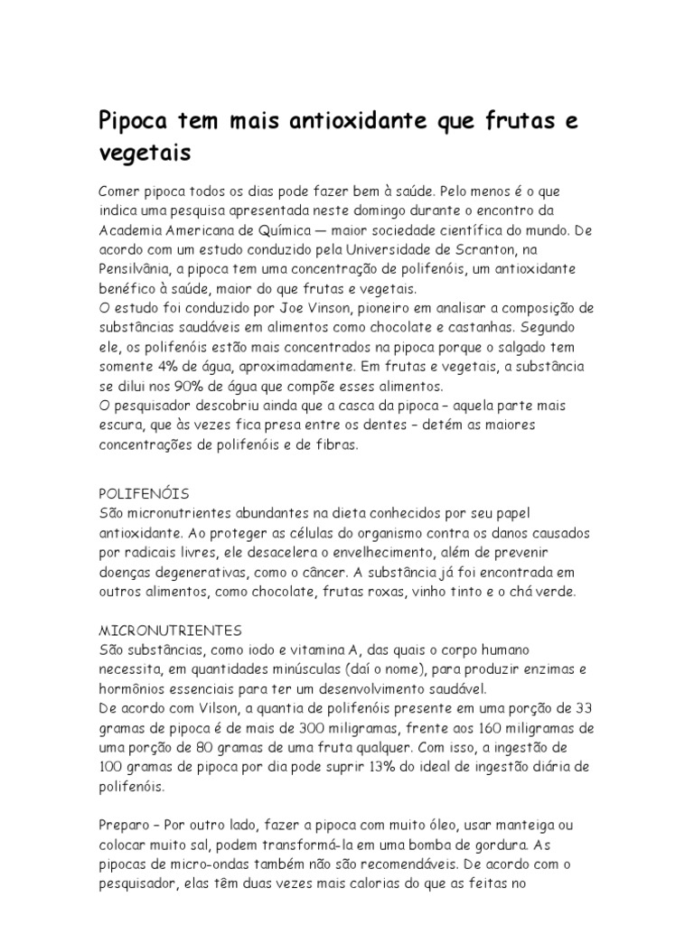 Concluso Atravs de pesquisas, cientistas poderam concluir que a pipoca possui uma concentrao de polifenis,que um antioxidante benfico a sade,maior que a concentrao de frutas e vegetais. Os polifenis esto mais concentrados na pipoca porque o salgado possue somente 4% de gua e em frutas e vegetais a substancia se dilui em 90%.mas somente a pipoca no substitui a necessidade de ingesto de frutas e legumes, Esses alimentos contm vitaminas e nutrientes