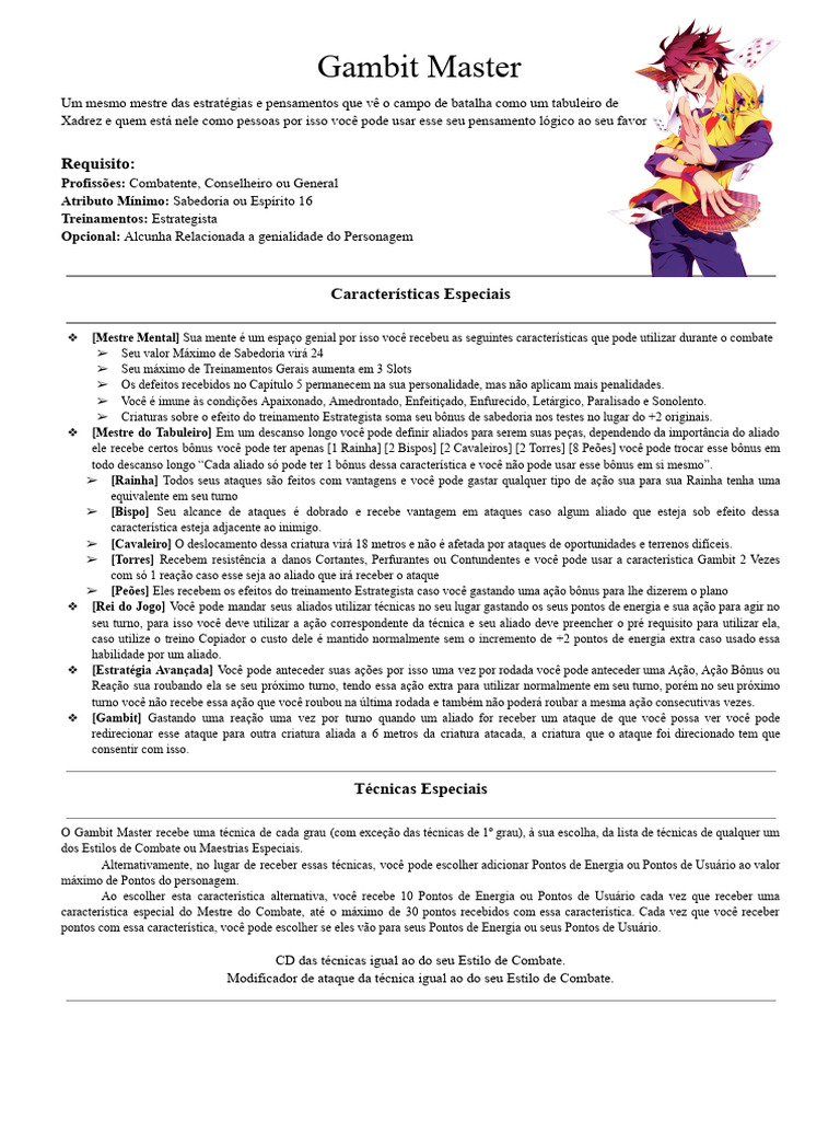❖ [Rei do Jogo] Você pode mandar seus aliados utilizar técnicas no seu lugar gastando os seus pontos de energia e sua ação para agir no