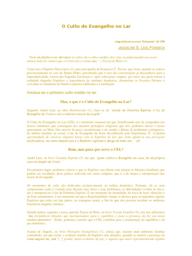 37. p. o aumento da cordialidade entre os que vivem sob o mesmo teto. diz que não devemos assim proceder quando temos filhos sob nossa tutela: “Se. o importante. Messe de Amor. cit.. Os Mensageiros. Os Mensageiros. p. Salvador: LEAL. 19. independentemente do número de membros da família que ora unida. 25. cap. 15.)”. 6. . ed. 17 XAVIER. p. José Raul. Francisco Cândido. cap. 37. 268 p. 35. 134 p. 5 XAVIER. ed. p. p. Vereda Familiar. 1996. E levemos aos irmãos que ainda não o cultivam a informação dos benefícios que ele proporciona. 99.Em contrapartida. 1987. porque a sua prática significa a proteção que o lar necessita contra as investidas das trevas. 464p. 37. sob a tua tutela. José Raul. 3. o alimento espiritual (. citadas anteriormente. cap. Portanto. ed. 14 XAVIER. Pelo Espírito Joanna de Ângelis. Divaldo Pereira. 25. ou basta só freqüentar o Centro e ler os livros doutrinários? Por vezes. os teus filhos estiverem. Niterói: Ed. ed. Rio de Janeiro: FEB. 9 FRANCO. 62. 12 ________. 3. 6 Op. 20. p. 8. ed. Nós somos responsáveis pelos nossos tutelados e responderemos se. p. cap. Pelo Espírito Joanna de Ângelis. ed. E afinal. quando já comecem a ensaiar o entendimento das coisas. É nosso dever levar a eles uma educação moral com base na Lei Natural. 3 _______.. a força necessária para resolver os problemas familiares de difícil solução. 158 p. 192 p. cuidando de nossos filhos para que lhes seja dado o devido encaminhamento religioso. p. independentemente do número de vezes que compareça ao Centro Espírita. 59. Os Mensageiros. 155 p. Estudo Evangélico no Lar. Pelo Espírito André Luiz. Pelo Espírito Joanna de Ângelis. igualmente. 70. Pelo Espírito Neio Lúcio. Francisco Cândido. 16 Op. ed.. para que seu lar esteja devidamente protegido dos ataques dos Espíritos levianos e zombeteiros. basta que esteja cumprindo sua “escala” semanal no Centro Espírita e que. ajudando-os nos dois ou três primeiros cultos.. 239. ao íntimo de seus futuros lares.. 213 p. Francisco Cândido. Pelo Espírito Tereza de Brito. cap. vestuário e moedas. Entretanto. assim. 37. p... 10 Idem. aquele que realmente nos sacia a fome de luz. imprescindível mesmo. 5. o “pão da vida” de que Jesus nos falou. Vereda Familiar. faça a sua prece. Rio de Janeiro: FEB. 1995. antes de dormir. p. que muito contribuirão para que se mantenha o clima de paz e harmonia que se segue aos minutos de leitura do Evangelho. ed. Rio de Janeiro: FEB. ibidem. 2001. cap. que todo espírita faça o CEL. 162. Florações Evangélicas. Pelo Espírito André Luiz. cap.. cap. 2 XAVIER. 22. para que. cap.. 11 XAVIER. 2001. 333. em especial quando pouco estuda as obras da Codificação e complementares. 2001. p. sem Deus. para que se habituem à rotina semanal e para que incorporem tal hábito.. É através do CEL que colhemos os benefícios de apaziguamento das animosidades no lar. por acaso. 248 p. 8 XAVIER. preferencialmente desde bem pequenos. 37. 1997. Rio de Janeiro: FEB.. ed. é a boa intenção na sua prática. o espírita desavisado. Divaldo Pereira. ensinando-os. medicamento e instrução. Referências Bibliográficas: 1 TEIXEIRA.. 99. a posteriori. 37 de Os Mensageiros 17. Renúncia.O. 166 p. III. Pelo Espírito Emmanuel. cap. cap. eles têm que participar do CEL. ed. É mediante o CEL que o nosso lar adquire aquelas barreiras magnéticas mencionadas por André Luiz no cap. cap. Família. ainda. Instituamos o Culto do Evangelho em nossos lares.. Conduta Espírita. 4 FRANCO. 2a parte. 96.. contida no Evangelho de Amor que o Cristo nos legou. 15 Teixeira. 1993. 19. é importante. Divaldo Pereira. acha que. 3. Jesus no Lar. Rio de Janeiro: FEB. Vale ressaltar que. Rio de Janeiro: FEB. não creias na validade do conceito de deixá-los ir. é importante mesmo que o espírita faça o CEL todas as semanas. levando-o. 2001. todavia. Fráter. o estreitamento dos laços de consangüinidade. p. Rio de Janeiro: FEB. Salvador: LEAL. cap. Divaldo Pereira. cit. ed. 37. 7 FRANCO. 63. Estudo Evangélico. eles falharem por omissão nossa. que é a Lei de Deus. Salvador: LEAL. e que realmente dá valia às potencialidades magnéticas e vibratórias do Culto do Evangelho no Lar. 1998.S. cap. Francisco Cândido. Desobsessão. ed. 33. 163. oferta-lhes. cap. 13 FRANCO. Francisco Cândido. 24. Rio de Janeiro: FEB. 23. S. 1. 59. Entre a Terra e o Céu. cap. é a freqüência na sua realização e a mudança de atitude dentro de casa. mais famílias possam recolher as luzes que nós já começamos a receber. 1995. 1994. sem religião. VI.. Como lhes dás agasalho e pão. Francisco Cândido. Messe de Amor. é a verdadeira ligação com os Mentores Espirituais.