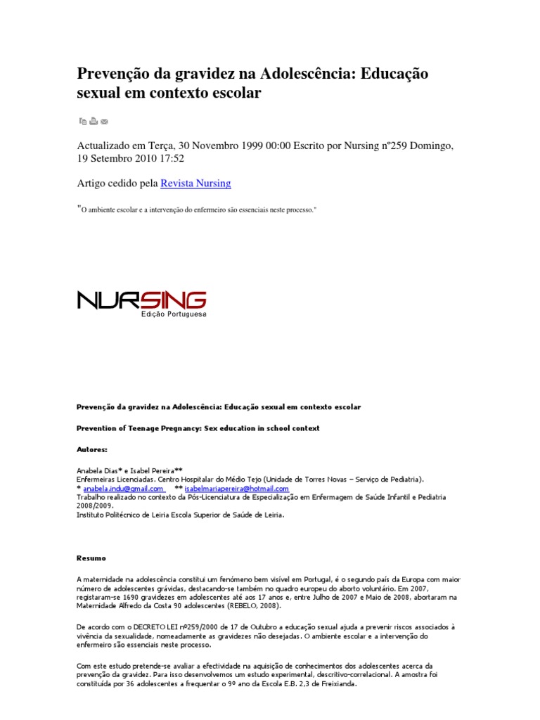 Preveno da gravidez na Adolescncia: Educao sexual em contexto escolar Prevention of Teenage Pregnancy: Sex education in school context Autores: Anabela Dias* e Isabel Pereira** Enfermeiras Licenciadas. Centro Hospitalar do Mdio Tejo (Unidade de Torres Novas Servio de Pediatria). * anabela.indu@gmail.com ** isabelmariapereira@hotmail.com Trabalho realizado no contexto da Ps-Licenciatura de Especializao em Enfermagem de Sade Infantil e Pediatria 2008/2009. Instituto Politcnico de Leiria Escola Superior de Sade de Leiria.