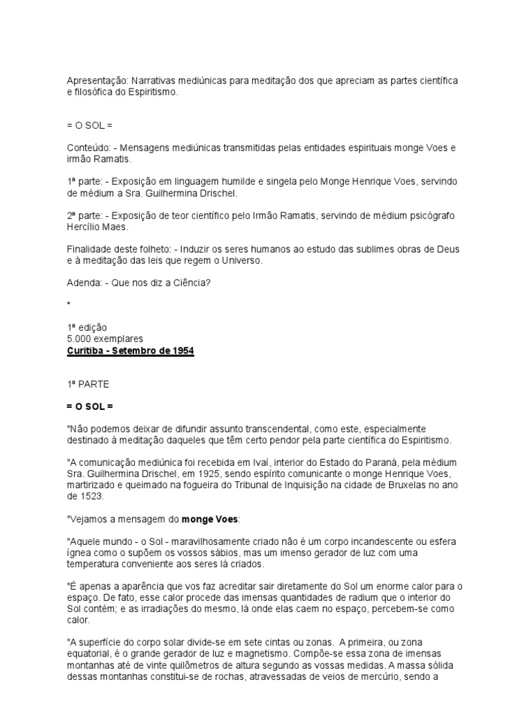 = O SOL = Conteúdo: - Mensagens mediúnicas transmitidas pelas entidades espirituais monge Voes e irmão Ramatis. 1ª parte: - Exposição em linguagem humilde e singela pelo Monge Henrique Voes, servindo de médium a Sra. Guilhermina Drischel. 2ª parte: - Exposição de teor científico pelo Irmão Ramatis, servindo de médium psicógrafo Hercílio Maes. Finalidade deste folheto: - Induzir os seres humanos ao estudo das sublimes obras de Deus e à meditação das leis que regem o Universo. Adenda: - Que nos diz a Ciência? * 1ª edição 5.000 exemplares Curitiba - Setembro de 1954 1ª PARTE = O SOL = "Não podemos deixar de difundir assunto transcendental, como este, especialmente destinado à meditação daqueles que têm certo pendor pela parte científica do Espiritismo. "A comunicação mediúnica foi recebida em Ivaí, interior do Estado do Paraná, pela médium Sra. Guilhermina Drischel, em 1925, sendo espírito comunicante o monge Henrique Voes, martirizado e queimado na fogueira do Tribunal de Inquisição na cidade de Bruxelas no ano de 1523. "Vejamos a mensagem do monge Voes: "Aquele mundo - o Sol - maravilhosamente criado não é um corpo incandescente ou esfera ígnea como o supõem os vossos sábios, mas um imenso gerador de luz com uma temperatura conveniente aos seres lá criados. "É apenas a aparência que vos faz acreditar sair diretamente do Sol um enorme calor para o espaço. De fato, esse calor procede das imensas quantidades de radium que o interior do Sol contém; e as irradiações do mesmo, lá onde elas caem no espaço, percebem-se como calor. "A superfície do corpo solar divide-se em sete cintas ou zonas. A primeira, ou zona equatorial, é o grande gerador de luz e magnetismo. Compõe-se essa zona de imensas montanhas até de vinte quilômetros de altura segundo as vossas medidas. A massa sólida dessas montanhas constitui-se de rochas, atravessadas de veios de mercúrio, sendo a