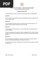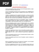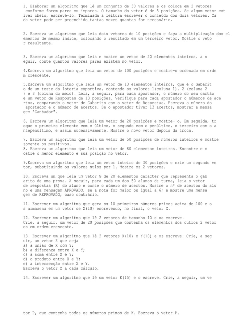 . Se algum vetor est iver cheio, escrev-lo. Terminada a leitura escrever o contedo dos dois vetores. Ca da vetor pode ser preenchido tantas vezes quantas for necessrio. 2. Escreva um algoritmo que leia dois vetores de 10 posies e faa a multiplicao dos el ementos de mesmo ndice, colocando o resultado em um terceiro vetor. Mostre o veto r resultante. 3. Escreva um algoritmo que leia e mostre um vetor de 20 elementos inteiros. a s eguir, conte quantos valores pares existem no vetor. 4.Escreva um algoritmo que leia um vetor de 100 posies e mostre-o ordenado em orde m crescente. 5.Escreva um algoritmo que leia um vetor de 13 elementos inteiros, que o Gabarit o de um teste da loteria esportiva, contendo os valores 1(coluna 1), 2 (coluna 2 ) e 3 (coluna do meio). Leia, a seguir, para cada apostador, o nmero do seu carto e um vetor de Respostas de 13 posies. Verifique para cada apostador o nmeros de ace rtos, comparando o vetor de Gabarito com o vetor de Respostas. Escreva o nmero do apostador e o nmero de acertos. Se o apostador tiver 13 acertos, mostrar a mensa gem "Ganhador". 6. Escreva um algoritmo que leia um vetor de 20 posies e mostre- o. Em seguida, tr oque o primeiro elemento com o ltimo, o segundo com o penltimo, o terceiro com o a ntepenltimo, e assim sucessivamente. Mostre o novo vetor depois da troca. 7. Escreva um algoritmo que leia um vetor de 50 posies de nmeros inteiros e mostre somente os positivos. 8. Escreva um algoritmo que leia um vetor de 80 elementos inteiros. Encontre e m ostre o menor elemento e sua posio no vetor. 9.Escreva um algoritmo que leia um vetor inteiro de 30 posies e crie um segundo ve tor, substituindo os valores nulos por 1. Mostre os 2 vetores. 10. Escreva um que leia um vetor G de 20 elementos caracter que representa o gab arito de uma prova. A seguir, para cada um dos 50 alunos da turma, leia o vetor de respostas (R) do aluno e conte o nmero de acertos. Mostre o n de acertos do alu no e uma mensagem APROVADO, se a nota for maior ou igual a 6; e mostre uma mensa gem de REPROVADO, caso contrrio. 11. Escrever um algoritmo que gera os 10 primeiros nmeros primos acima de 100 e o s armazena em um vetor de X(10) escrevendo, no final, o vetor X. 12. Escrever um algoritmo que l 2 vetores de tamanho 10 e os escreve. Crie, a seguir, um vetor de 20 posies que contenha os elementos dos outros 2 vetor es em ordem crescente. 13. Escrever um algoritmo que l 2 vetores X(10) e Y(10) e os escreve. Crie, a seg uir, um vetor Z que seja a) a unio de X com Y; b) a diferena entre X e Y; c) a soma entre X e Y; d) o produto entre X e Y; e) a interseco entre X e Y. Escreva o vetor Z a cada clculo. 14. Escrever um algoritmo que l um vetor K(15) e o escreve. Crie, a seguir, um ve