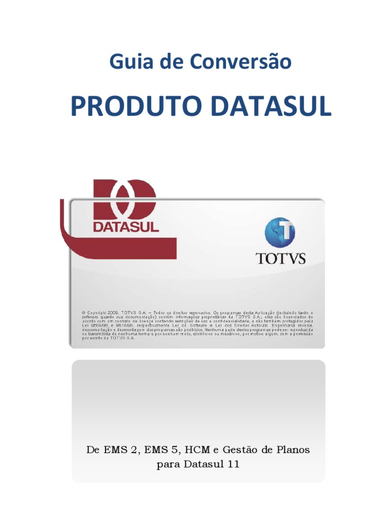 deixe de utilizar algum banco de dados se for explicitamente recomendado pelo suporte tcnico do produto Datasul. O Datasul 11 ser composto pelos bancos de dados convertidos mais os bancos correspondente a novas funcionalidades. Os seguintes arquivos do sistema Datasul tambm devero ser conferidos para contemplar os bancos convertidos: Arquivo .pf de conexo dos bancos: conferir se os bancos convertidos esto contemplados na conexo, bem como bancos especficos trazidos no processo; Arquivo [Link] no JBoss: o banco com dados EMS2UNI necessrio para a execuo do ambiente Flex. Esse arquivo contm os parmetros de conexo a esse banco, que pode estar unificado aos bancos de dados origem. Programa de alias, caso seus bancos sejam unificados.
