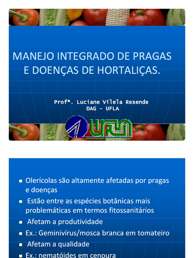 Olercolas so altamente afetadas por pragas e doenas Esto entre as espcies botnicas mais problemticas em termos fitossanitrios Afetam a produtividade Ex.: Geminivrus/mosca branca em tomateiro Geminivrus/mosca Afetam a qualidade Ex.: nematides em cenoura Tomate, batata, Brssicas