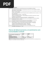 EMPAER, SEBRAE entre outras apoio do Estado EMPAER dotando-a de melhores condies de assessoramento permanente aos assentados e criao de canais adequados de comercializao e escoamento da produo. Ser fundamental ainda um esforo para envolver o governo federal atravs de seus programas voltados para o desenvolvimento local e comunitrio Ministrio de Desenvolvimento Social / MDS, Ministrio do Desenvolvimento Agrrio / MDA, Ministrio do Meio Ambiente / MMA, INCRA Infra-estrutura e Servios Solucionar a questo da falta dgua para consumo e produo (agrcola e de subsistncia) Manuteno, melhoria do piso das estradas (asfaltamento at Chapada dos Guimares) e construo de ponte para permitir escoar a produo e incentivar o turismo rural Iluminao da Praa em Joo Carro necessria a articulao institucional envolvendo Prefeitura, Governo do Estado de MT, Associaes de Moradores e Produtores, lideranas do MAB e FURNAS. Sade Prover atendimento mdico regular no Posto de Sade, suficiente para atender a populao moradora com servio odontolgico e medicamentos. Educao Equipar a escola com computadores, sala de vdeo e parque com brinquedos Instalar um telecentro de informtica com cursos e acesso internet para qualificar os jovens ao primeiro emprego Incentivar e viabilizar a compra direta da merenda escolar, pela Prefeitura, dos produtores locais implantar um sistema de transporte escolar noturno que favorea a ampliao de cursos noturnos e ampliar o nmero de nibus para o transporte dos estudantes do turno diurno necessria a articulao institucional envolvendo Prefeitura, Secretaria Estadual de Educao, Associaes de Moradores, Conselho de Pais e FURNAS. Assistncia Social Prover atendimento para regularizao documental da populao moradora FURNAS se comprometeu a estudar possibilidade de trazer para a regio o Projeto Aldeia da Cidadania para atender as trs comunidades.