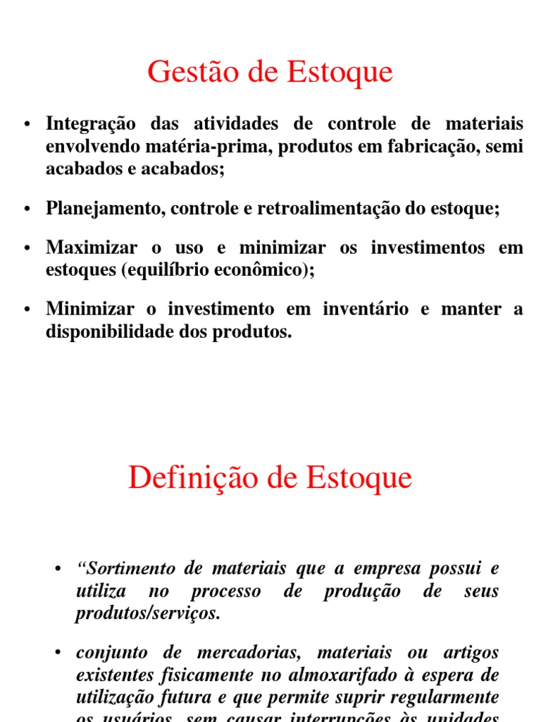 Curva ABC Nveis de Estoque Lote Econmico Ponto de pedido Estoque minimo