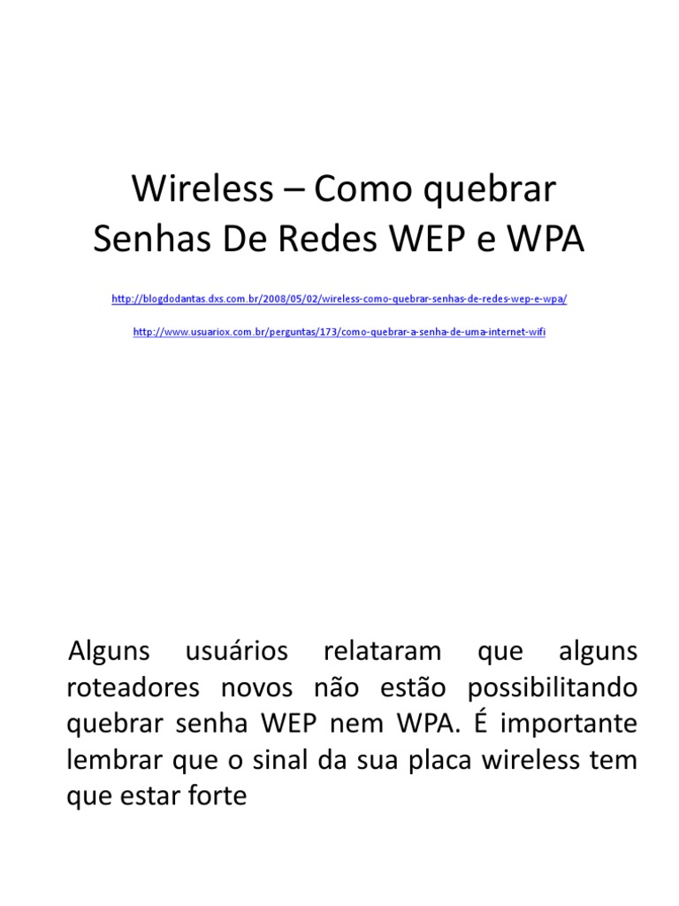 http://blogdodantas.dxs.com.br/2008/05/02/wireless-como-quebrar-senhas-de-redes-wep-e-wpa/ http://www.usuariox.com.br/perguntas/173/como-quebrar-a-senha-de-uma-internet-wifi