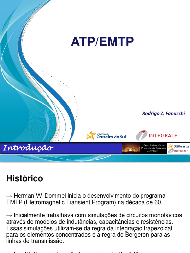 Herman W. Dommel inicia o desenvolvimento do programa EMTP (Eletromagnetic Transient Program) na dcada de 60. Inicialmente trabalhava com simulaes de circuitos monofsicos atravs de modelos de indutncias, capacitncias e resistncias. Essas simulaes utilizam-se da regra da integrao trapezoidal para os elementos concentrados e a regra de Bergeron para as linhas de transmisso. Em 1973 a coordenao fica a cargo de Scott Meyer. Estabelece-se um processo de desenvolvimento articulado com os usurios.
