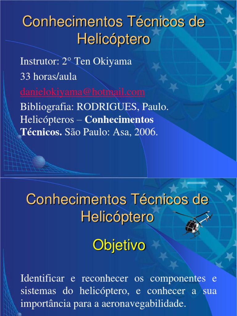 Instrutor: 2 Ten Okiyama 33 horas/aula danielokiyama@hotmail.com Bibliografia: RODRIGUES, Paulo. Helicpteros Conhecimentos Tcnicos. So Paulo: Asa, 2006.