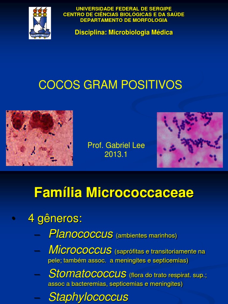 FAMLIA MICROCOCCACEAE (contedo G-C 66 - 75%) Arthrobacter, Micrococcus, Kocuria, Nesterenkonia, Rothia, Stomatococcus, Terracoccus, Renibacterium, Demetria, Leucobacter, Bogoriella FAMLIA STAPHYLOCOCCACEAE (contedo G-C 30 - 45%) Staphylococcus, Macrococcus (1998), Gemella, Salinicoccus