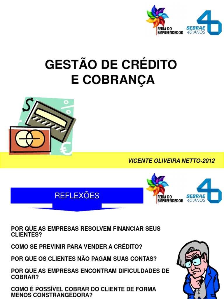 Tem por objetivo promover o retorno do dinheiro ou do capital investido numa operao de [Link] gesto envolve todas as etapas de recebimento dos valores cedidos aos clientes, as vrias formas de recebimento das parcelas, os contatos com os clientes, at a ltima ao efetiva para se tentar recuperar o recurso investido pela empresa na operao de crdito.