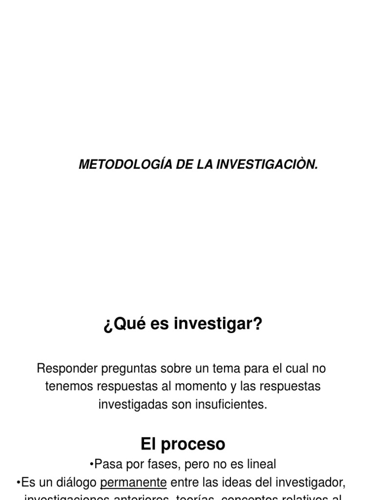 pero no es lineal •Es un diálogo permanente entre las ideas del investigador. teorías. investigaciones anteriores. El proceso •Pasa por fases.¿Qué es investigar? Responder preguntas sobre un tema para el cual no tenemos respuestas al momento y las respuestas investigadas son insuficientes. conceptos relativos al tema y los datos que se recaben. .