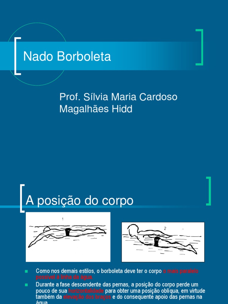 Como nos demais estilos, o borboleta deve ter o corpo o mais paralelo possvel linha da gua. Durante a fase descendente das pernas, a posio do corpo perde um pouco de sua horizontalidade para obter uma posio oblqua, em virtude tambm da elevao dos braos e do consequente apoio das pernas na gua. O equilbrio do corpo est condicionado s aes dos membros. A passagem simultnea do brao acima da superfcie, com arremesso dos braos frente, s poder ser possvel com um abaixamento da cabea e uma ligeira elevao dos quadris.