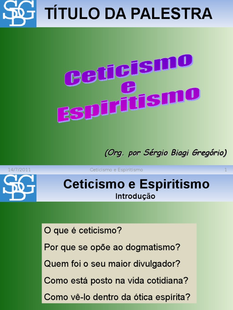 Ceticismo e Espiritismo Introdução O que é ceticismo? Por que se opõe ao dogmatismo? Quem foi o seu maior divulgador? Como está posto na vida cotidiana? Como vê-lo dentro da ótica espírita? 14/7/2011 Ceticismo e Espiritismo 2 .