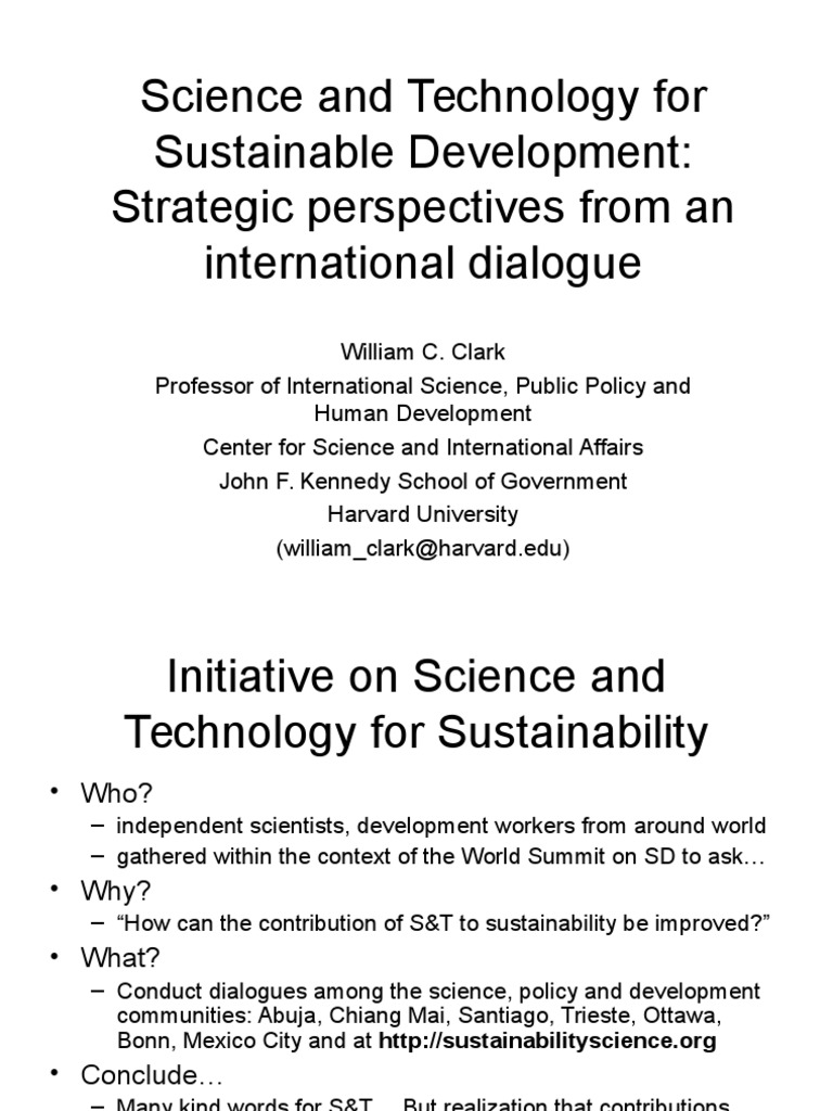 edu . William Clark – Center for Science and International Affairs – Kennedy School of Government – Harvard University – Cambridge MA 02138 USA – william_clark@harvard.For further information… • On the challenge of harnessing science and technology for sustainability – http://sustainabilityscience.org • Prof.