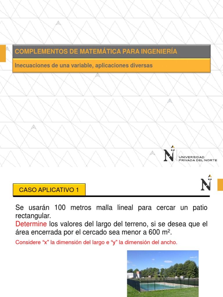 =]-∞.20[ U ]30. se tiene que: 2x+2y=100 o x+y=50 Nos piden ¿x? para que el área encerrada por el cercado sea menor a 600 m2 .20[ U ]30.+∞[ Sabiendo que x>0 e y=50-x>0 Se concluye que: El intervalo ]0. SOLUCIÓN CASO APLICATIVO 1 Dado que x: largo e y: ancho y que el patio es rectangular. Es decir que: xy<600 x(50-x)<600 50x-x2 <600 0<x2 -50x+600 0<(x-20)(x-30) C. .S.50[ es el conjunto de valores que puede tomar el largo del terreno.
