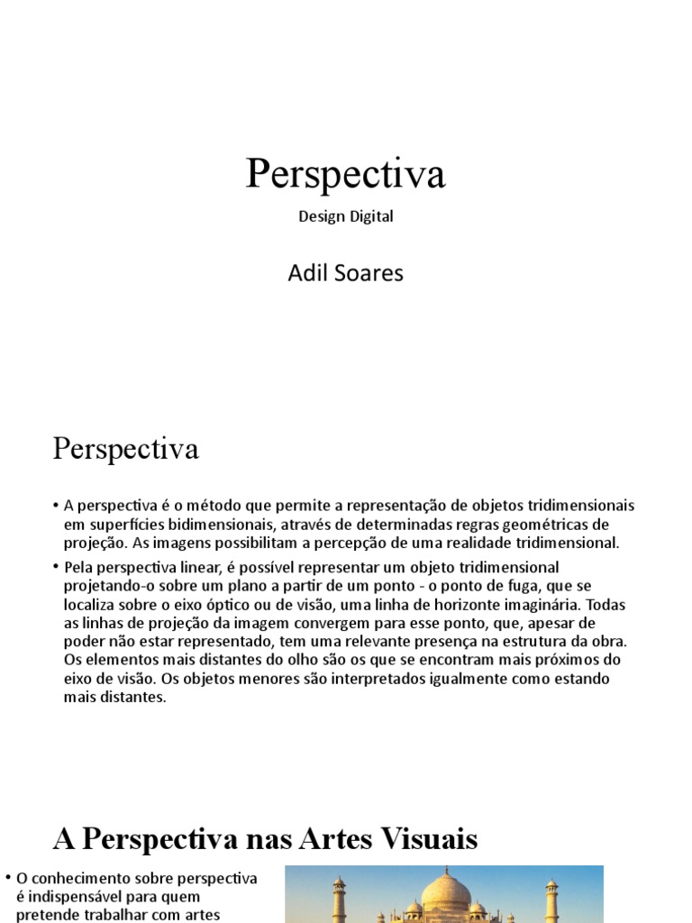 Nas artes visuais a perspectiva pode ser definida como um recurso gráfico que utiliza o