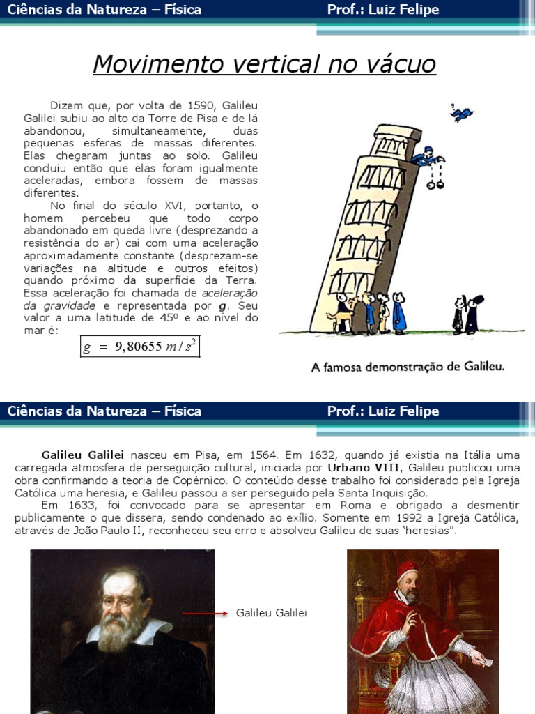 Todo corpo em movimento vertical para baixo tem aceleração constante e igual à aceleração da
