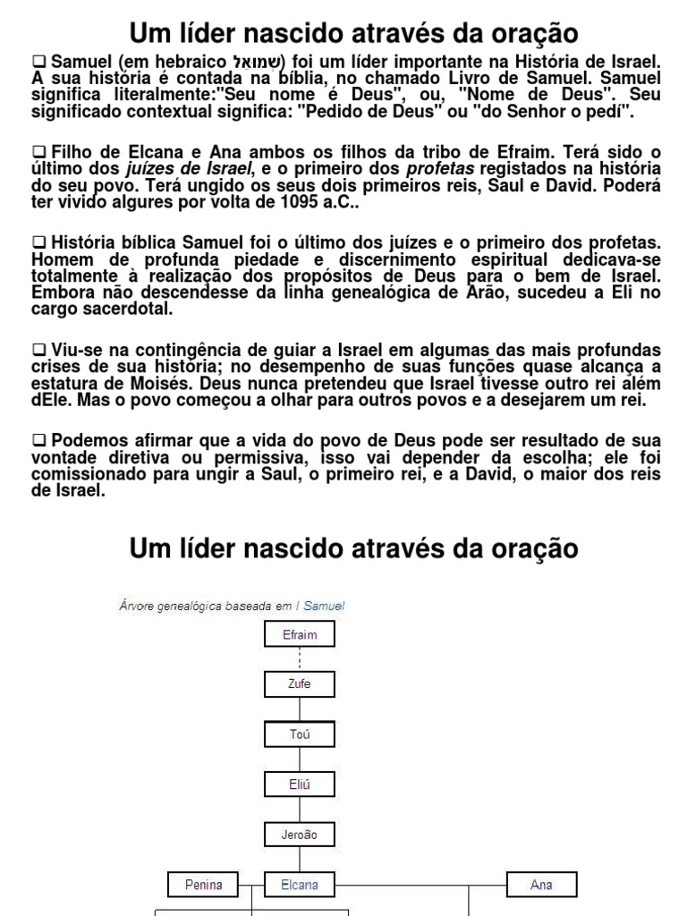 Samuel (em hebraico ) foi um lder importante na Histria de Israel. A sua histria contada na bblia, no chamado Livro de Samuel. Samuel significa literalmente:"Seu nome Deus", ou, "Nome de Deus". Seu significado contextual significa: "Pedido de Deus" ou "do Senhor o ped". Filho de Elcana e Ana ambos os filhos da tribo de Efraim. Ter sido o ltimo dos juzes de Israel, e o primeiro dos profetas registados na histria do seu povo. Ter ungido os seus dois primeiros reis, Saul e David. Poder ter vivido algures por volta de 1095 a.C.. Histria bblica Samuel foi o ltimo dos juzes e o primeiro dos profetas. Homem de profunda piedade e discernimento espiritual dedicava-se totalmente realizao dos propsitos de Deus para o bem de Israel. Embora no descendesse da linha genealgica de Aro, sucedeu a Eli no cargo sacerdotal. Viu-se na contingncia de guiar a Israel em algumas das mais profundas crises de sua histria; no desempenho de suas funes quase alcana a estatura de Moiss. Deus nunca pretendeu que Israel tivesse outro rei alm dEle. Mas o povo comeou a olhar para outros povos e a desejarem um rei. Podemos afirmar que a vida do povo de Deus pode ser resultado de sua vontade diretiva ou permissiva, isso vai depender da escolha; ele foi comissionado para ungir a Saul, o primeiro rei, e a David, o maior dos reis de Israel.