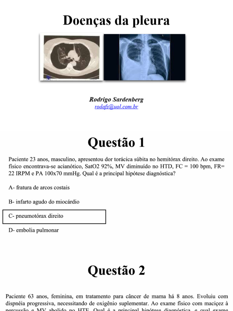 25 anos, dor torácica súbita e dispnéia. Oximetria 95%, Fc=80 bpm.