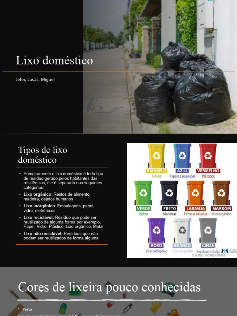 Papel, Vidro, Plástico, Lixo orgânico, Metal.