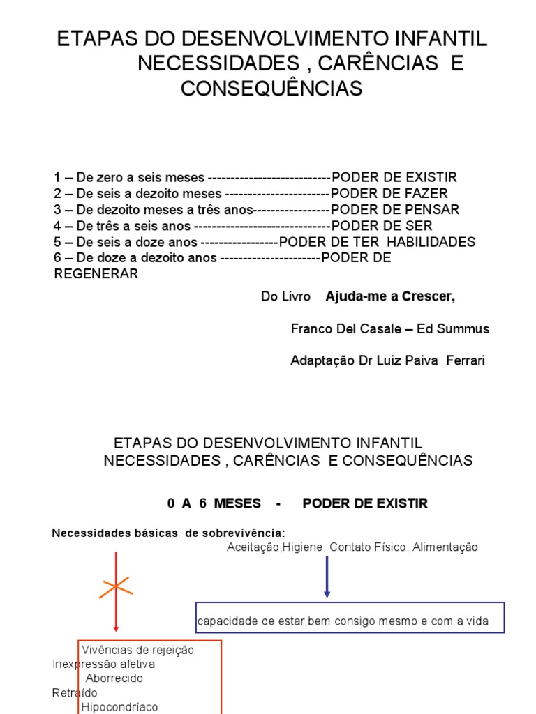 1 – De zero a seis meses ---------------------------PODER DE EXISTIR 2 – De seis a dezoito meses -----------------------PODER DE FAZER 3 – De dezoito meses a três anos-----------------PODER DE PENSAR 4 – De três a seis anos ------------------------------PODER DE SER 5 – De seis a doze anos -----------------PODER DE TER HABILIDADES 6 – De doze a dezoito anos ----------------------PODER DE REGENERAR Do Livro Ajuda-me a Crescer,
