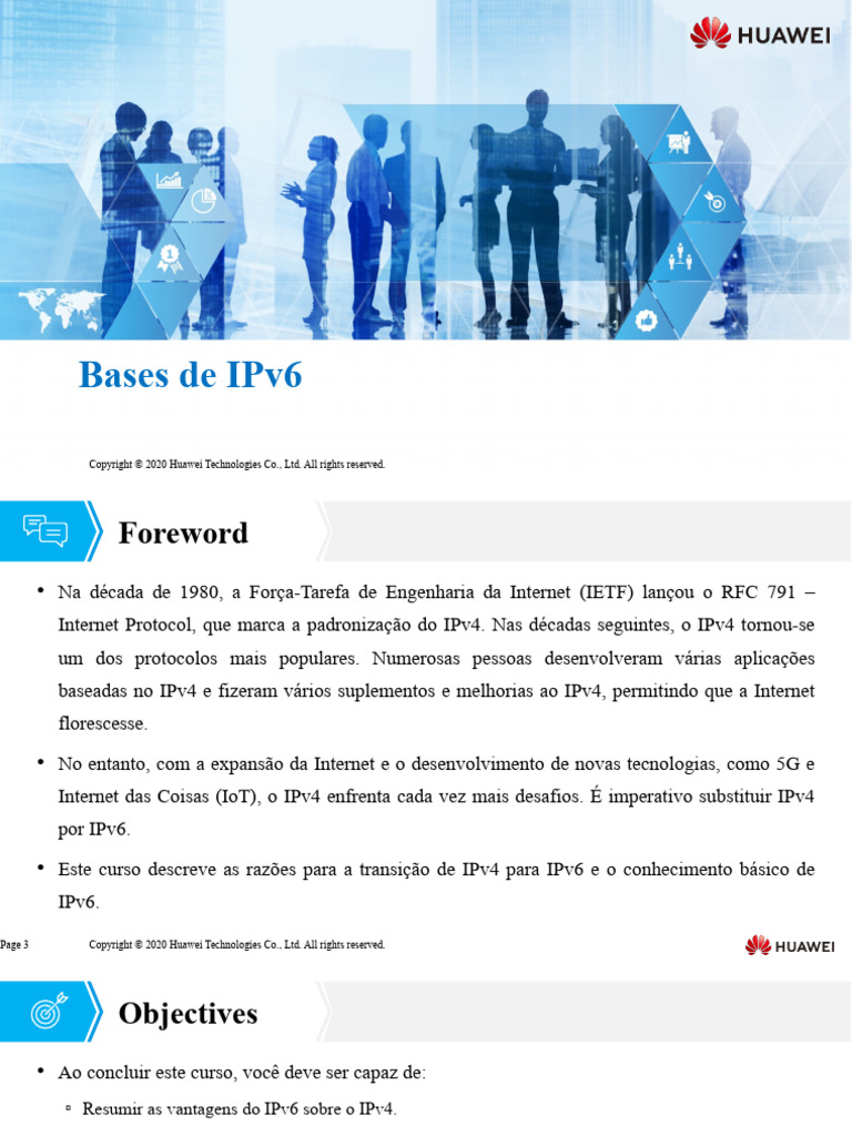 Este curso descreve as razões para a transição de IPv4 para IPv6 e o conhecimento básico de